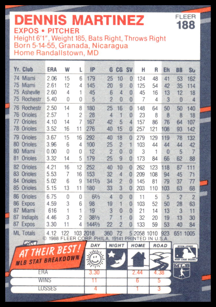 This Baseball card, from 1988 is part of the Fleer  card set. Dennis Martinez is featured and has a card number of 188.