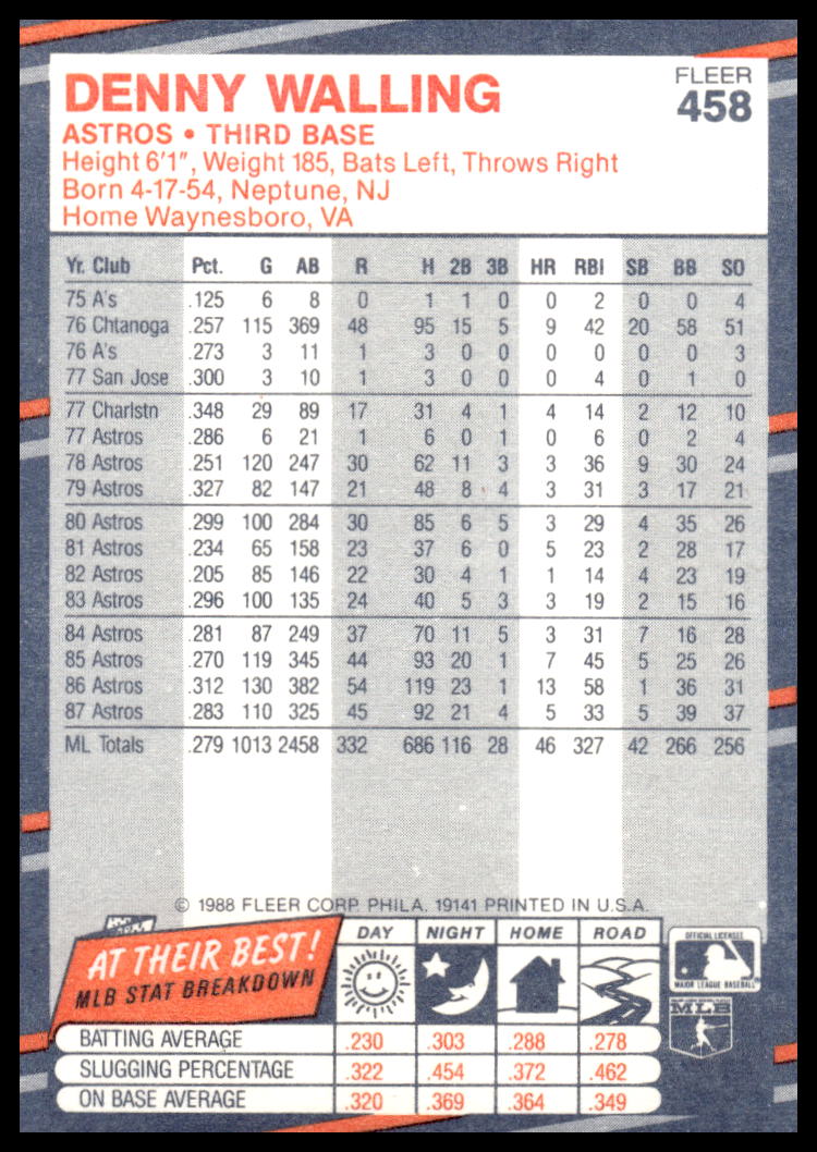 This Baseball card, from 1988 is part of the Fleer  card set. Denny Walling is featured and has a card number of 458.