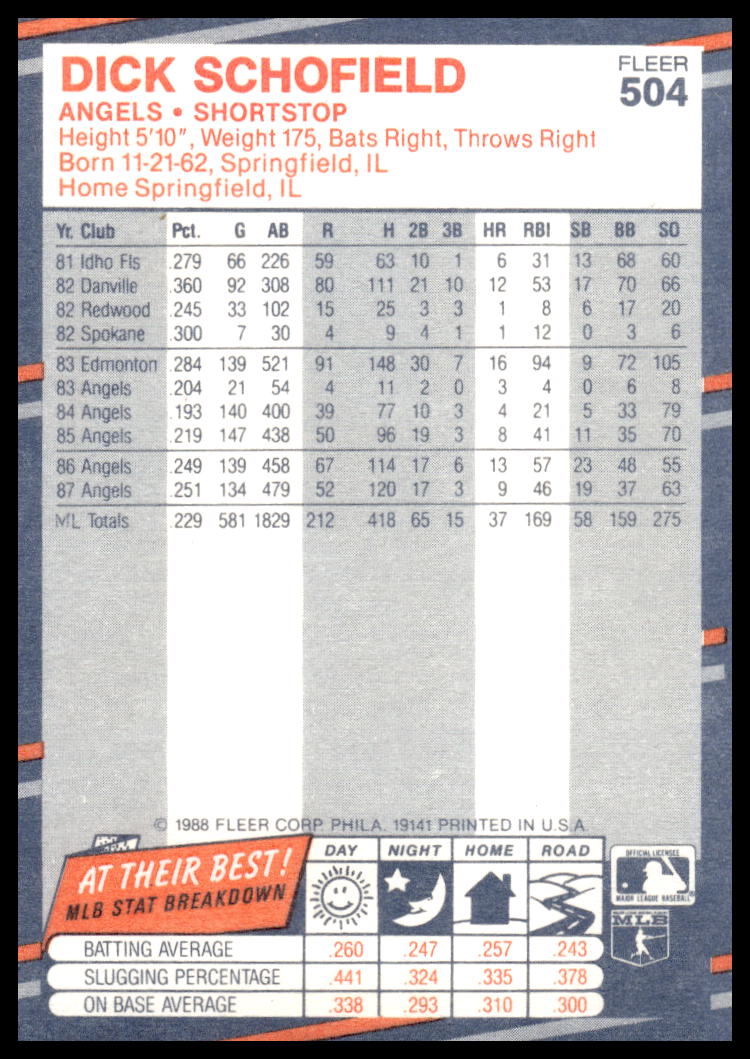 This Baseball card, from 1988 is part of the Fleer  card set. Dick Schofield is featured and has a card number of 504.