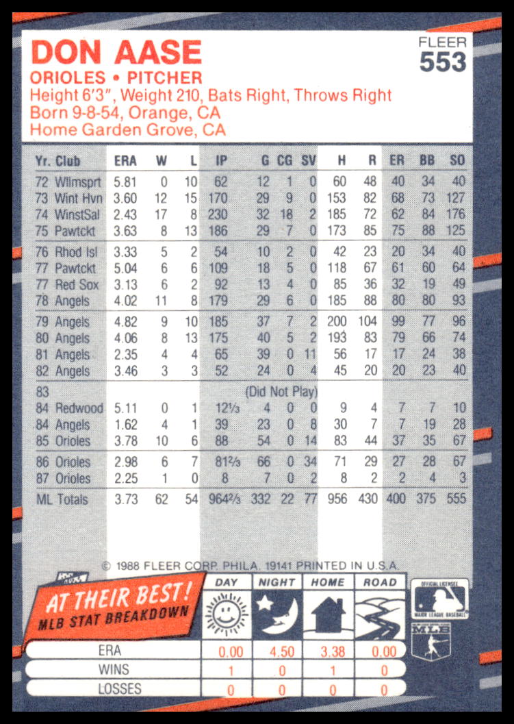 This Baseball card, from 1988 is part of the Fleer  card set. Don Aase is featured and has a card number of 553.