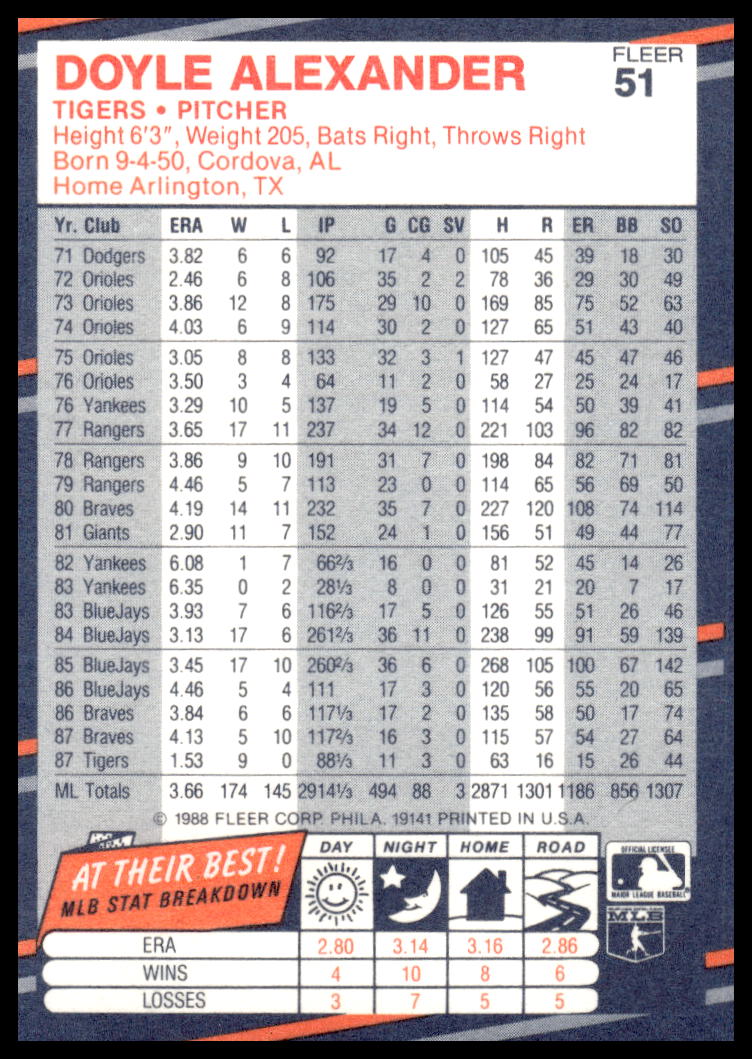 This Baseball card, from 1988 is part of the Fleer  card set. Doyle Alexander is featured and has a card number of 51.