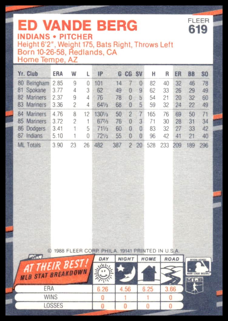 This Baseball card, from 1988 is part of the Fleer  card set. Ed Vande Berg is featured and has a card number of 619.