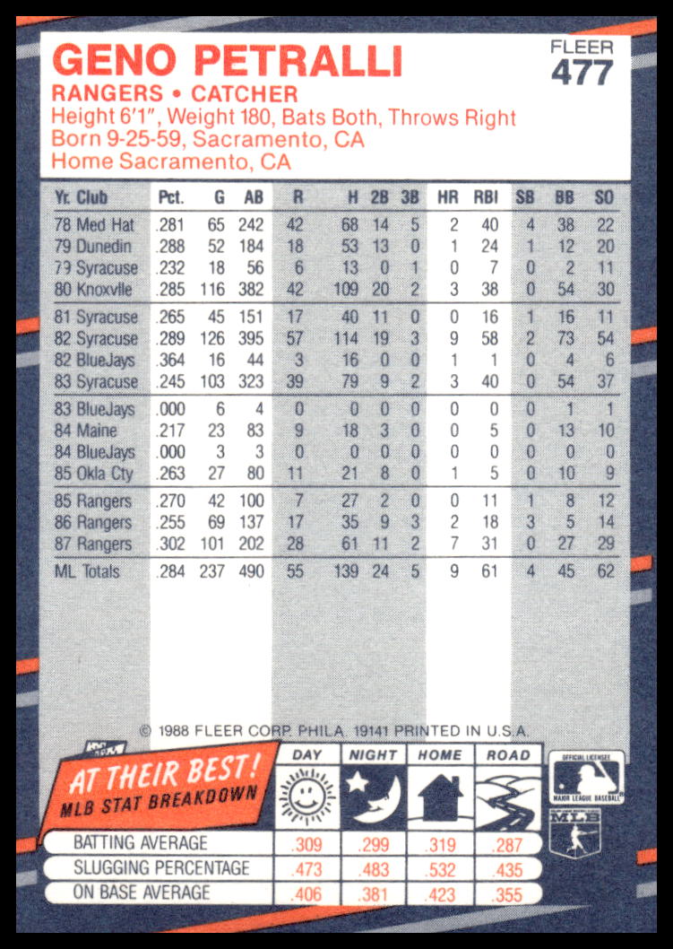 This Baseball card, from 1988 is part of the Fleer  card set. Geno Petralli is featured and has a card number of 477.