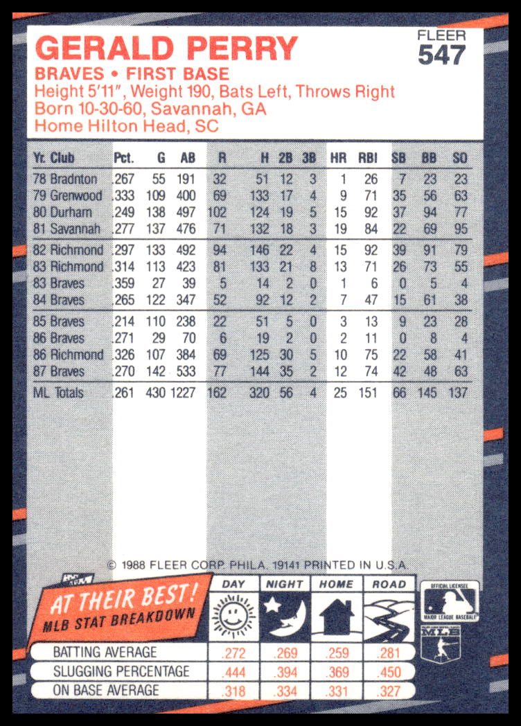 This Baseball card, from 1988 is part of the Fleer  card set. Gerald Perry is featured and has a card number of 547.