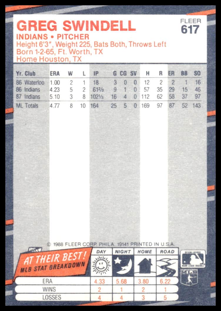 This Baseball card, from 1988 is part of the Fleer  card set. Greg Swindell is featured and has a card number of 617.