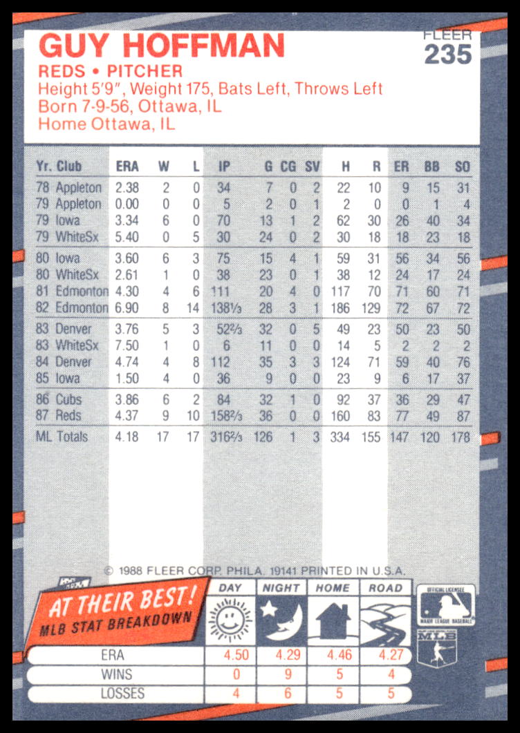 This Baseball card, from 1988 is part of the Fleer  card set. Guy Hoffman is featured and has a card number of 235.