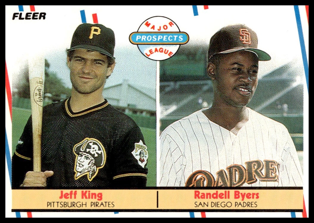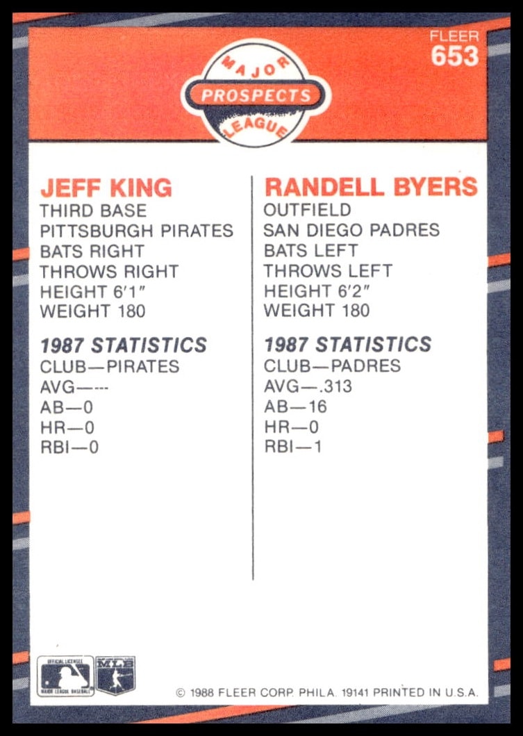 This Baseball card, from 1988 is part of the Fleer  card set. Jeff King / Randall Byers is featured and has a card number of 653.
