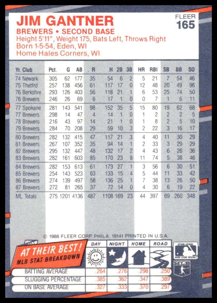 This Baseball card, from 1988 is part of the Fleer  card set. Jim Gantner is featured and has a card number of 165.