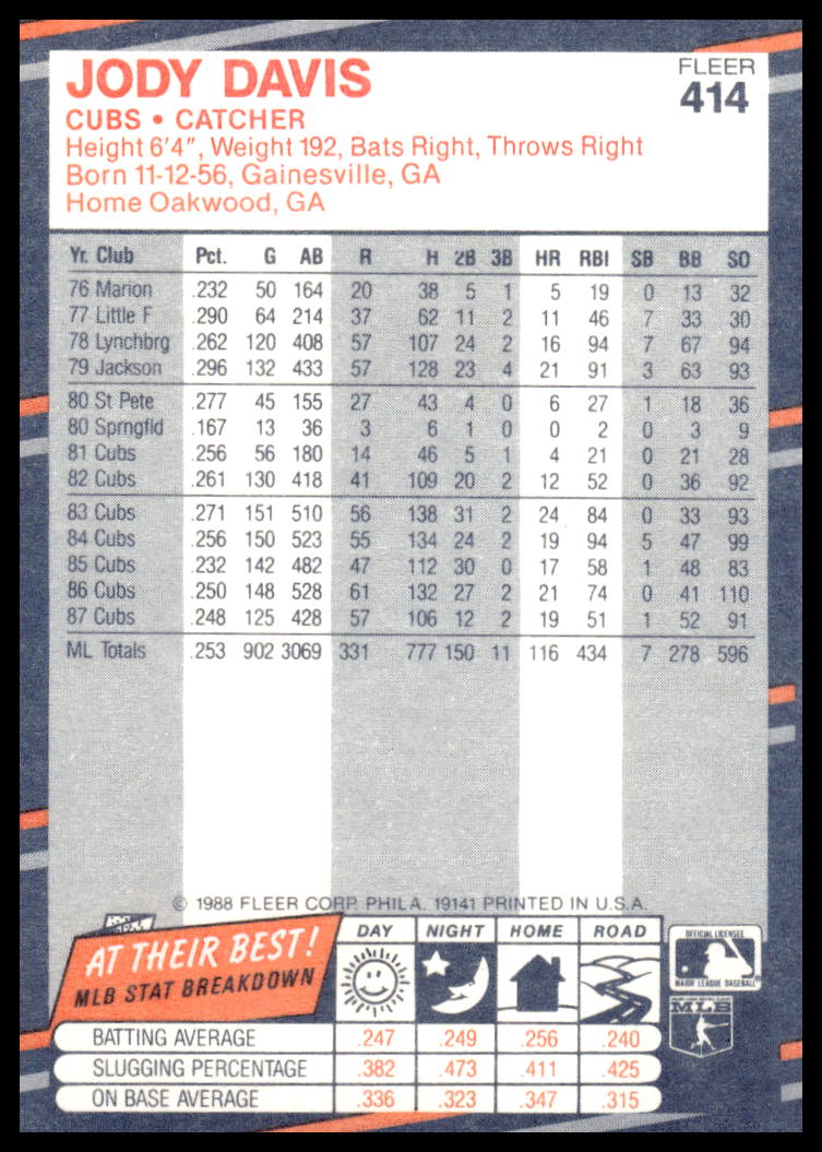 This Baseball card, from 1988 is part of the Fleer  card set. Jody Davis is featured and has a card number of 414.
