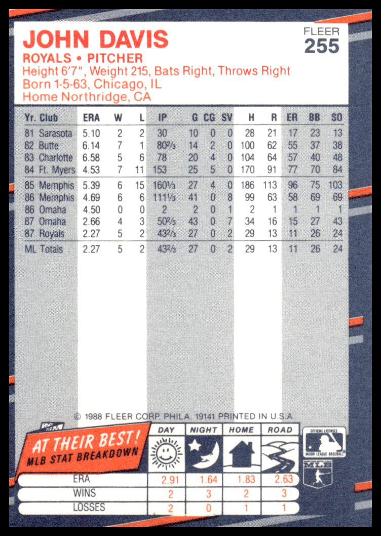 This Baseball card, from 1988 is part of the Fleer  card set. John Davis is featured and has a card number of 255.