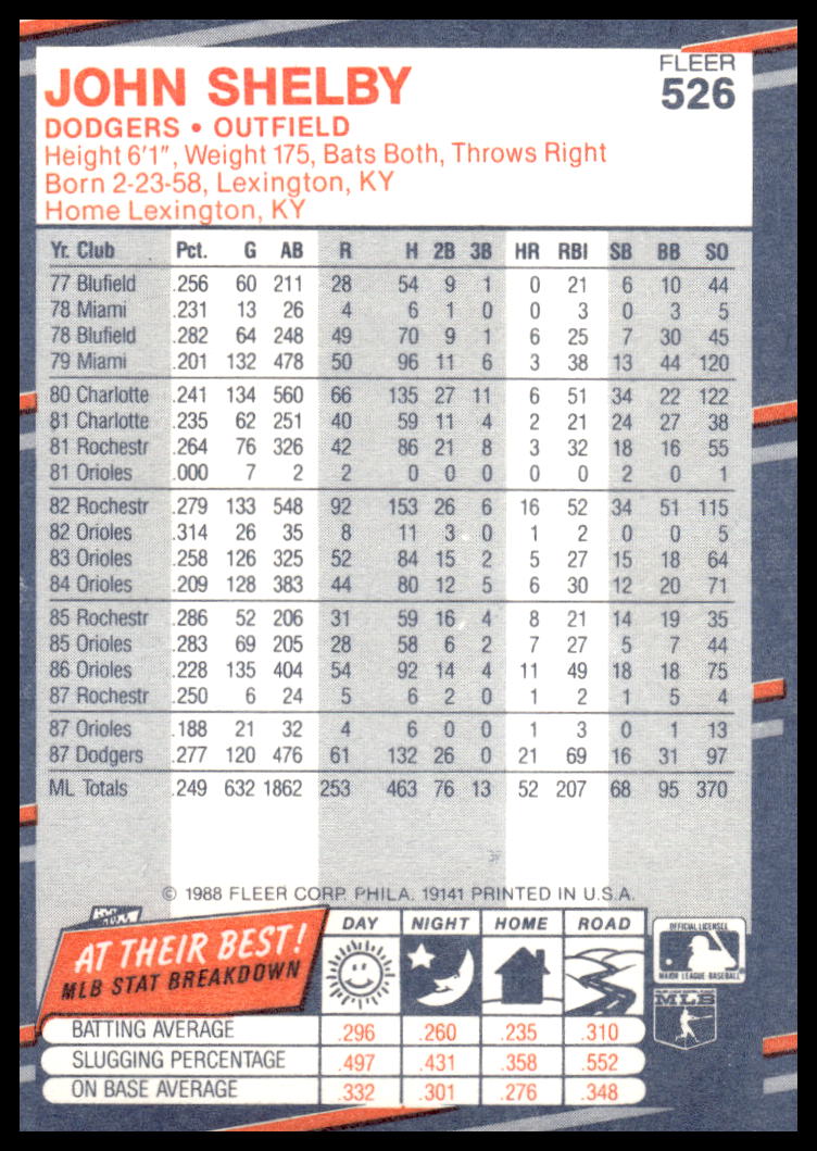 This Baseball card, from 1988 is part of the Fleer  card set. John Shelby is featured and has a card number of 526.