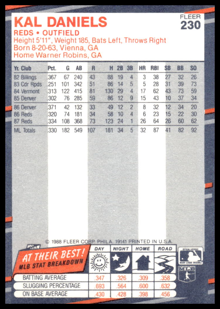 This Baseball card, from 1988 is part of the Fleer  card set. Kal Daniels is featured and has a card number of 230.