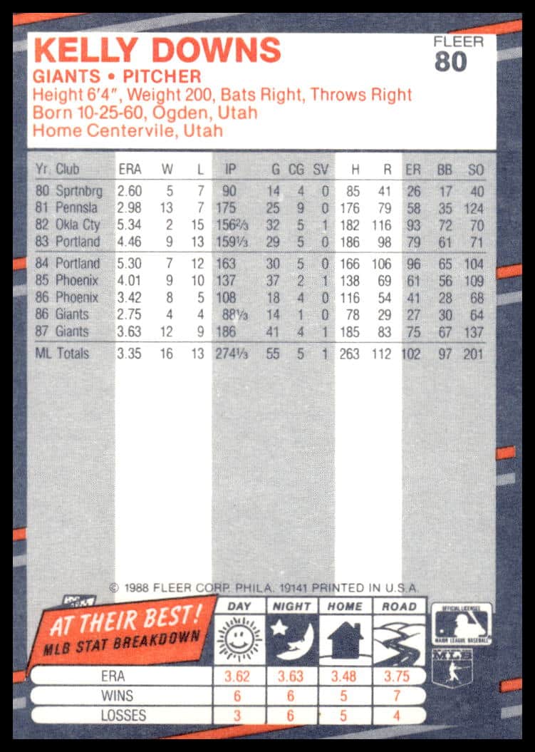 This Baseball card, from 1988 is part of the Fleer  card set. Kelly Downs is featured and has a card number of 80.