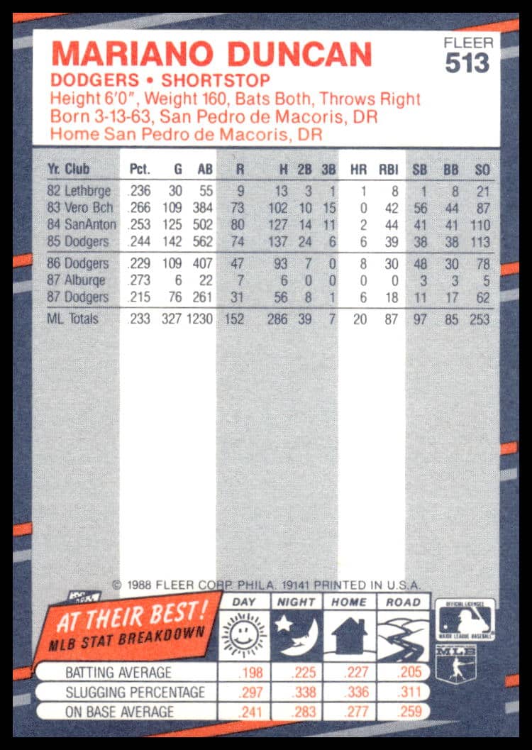 This Baseball card, from 1988 is part of the Fleer  card set. Mariano Duncan is featured and has a card number of 513.