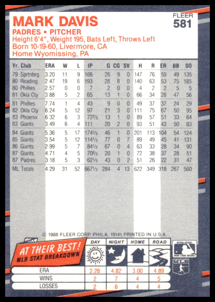 This Baseball card, from 1988 is part of the Fleer  card set. Mark Davis is featured and has a card number of 581.