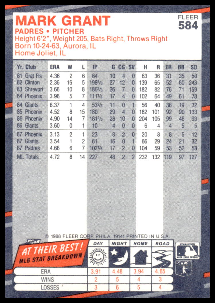 This Baseball card, from 1988 is part of the Fleer  card set. Mark Grant is featured and has a card number of 584.