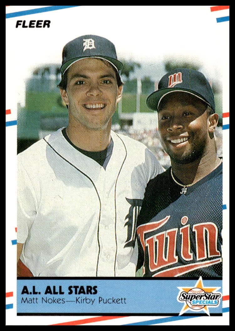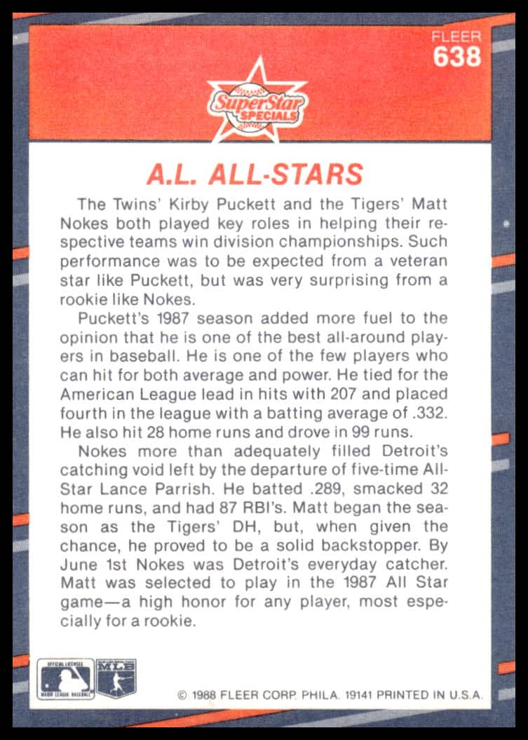 This BaseballΒ card, from 1988 is part of the Fleer Β card set. Matt Nokes / Kirby Puckett is featured and has a card number of 638.