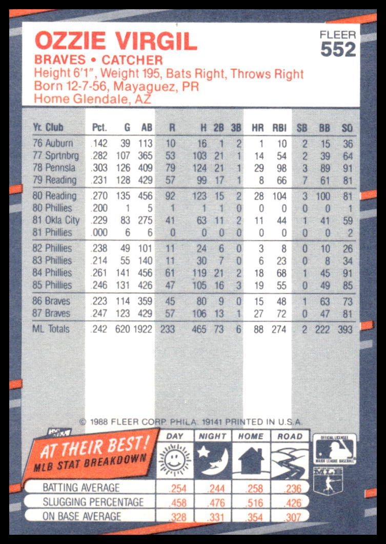 This Baseball card, from 1988 is part of the Fleer  card set. Ozzie Virgil is featured and has a card number of 552.