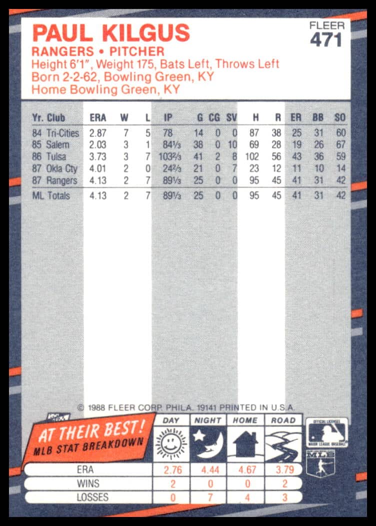 This Baseball card, from 1988 is part of the Fleer  card set. Paul Kilgus is featured and has a card number of 471.