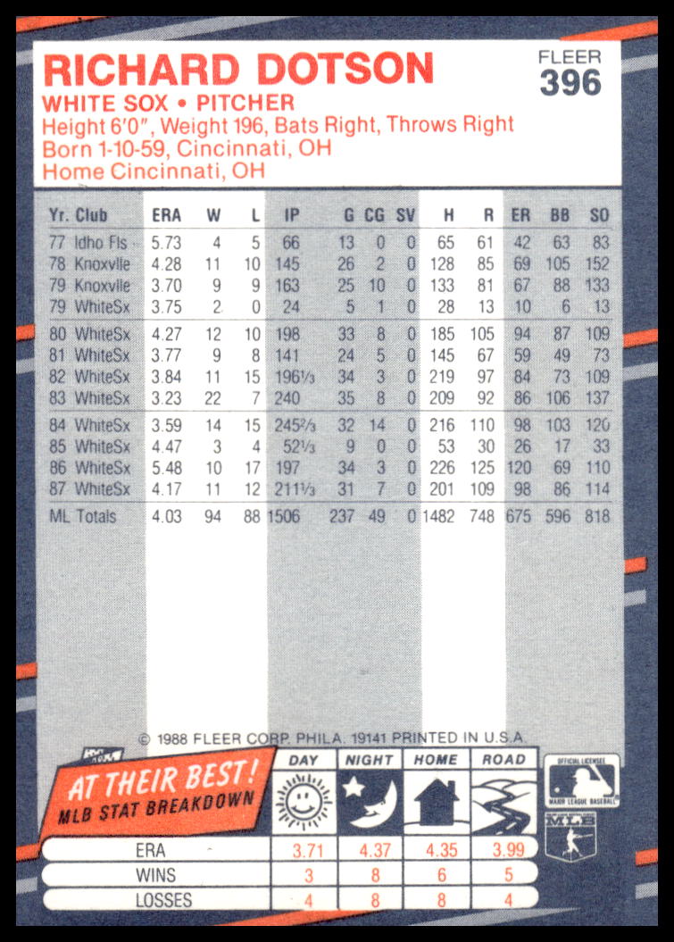 This Baseball card, from 1988 is part of the Fleer  card set. Richard Dotson is featured and has a card number of 396.