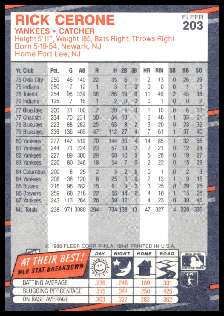 This Baseball card, from 1988 is part of the Fleer  card set. Rick Cerone is featured and has a card number of 203.