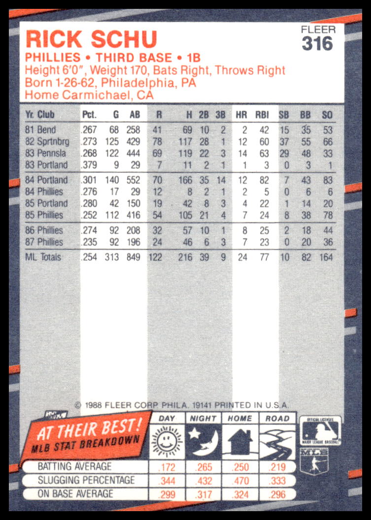 This Baseball card, from 1988 is part of the Fleer  card set. Rick Schu is featured and has a card number of 316.