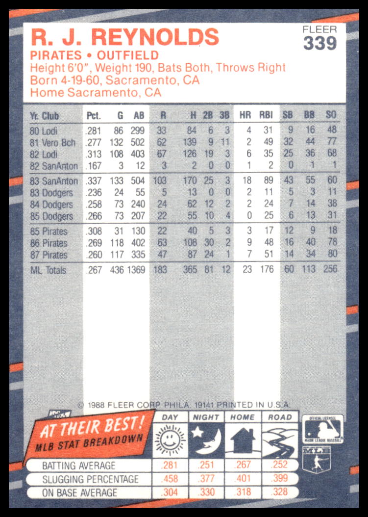 This Baseball card, from 1988 is part of the Fleer  card set. R.J. Reynolds is featured and has a card number of 339.