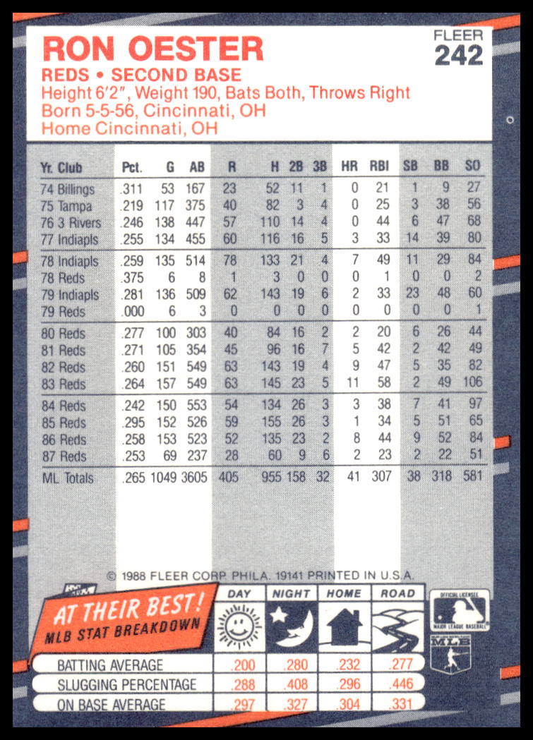 This Baseball card, from 1988 is part of the Fleer  card set. Ron Oester is featured and has a card number of 242.