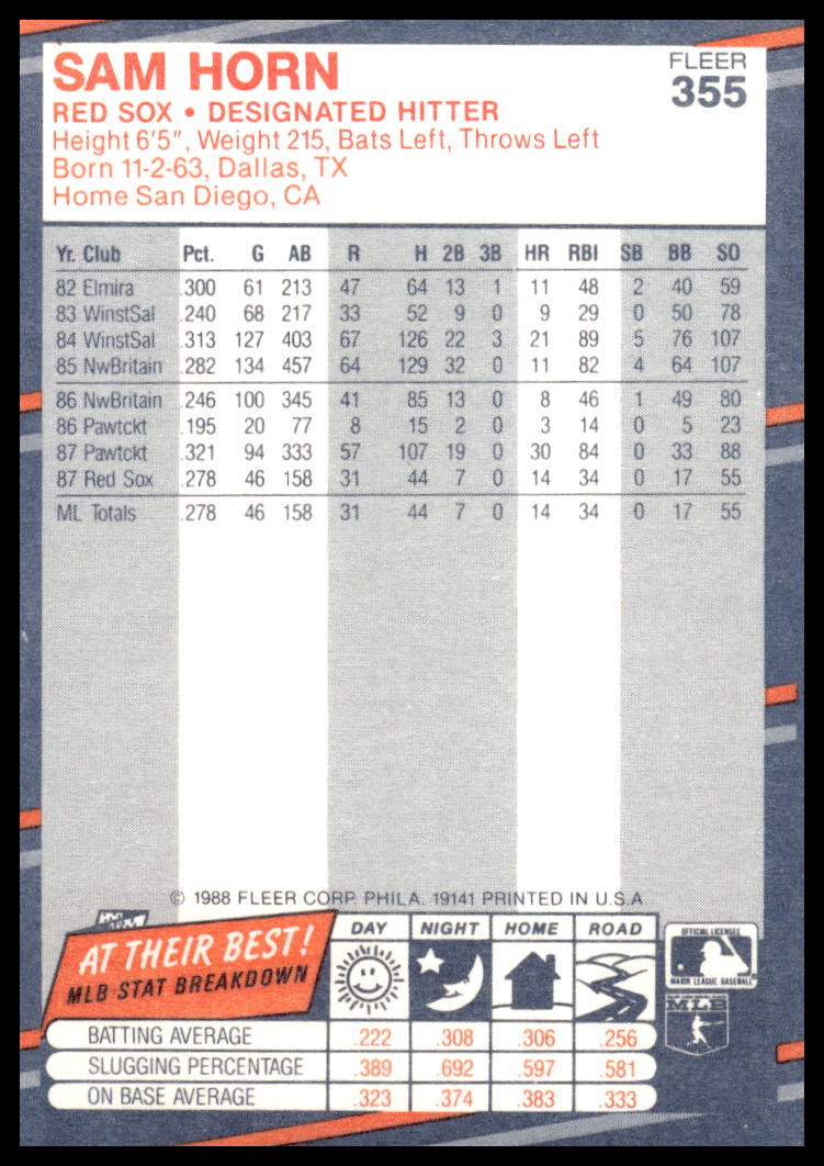 This Baseball card, from 1988 is part of the Fleer  card set. Sam Horn is featured and has a card number of 355.