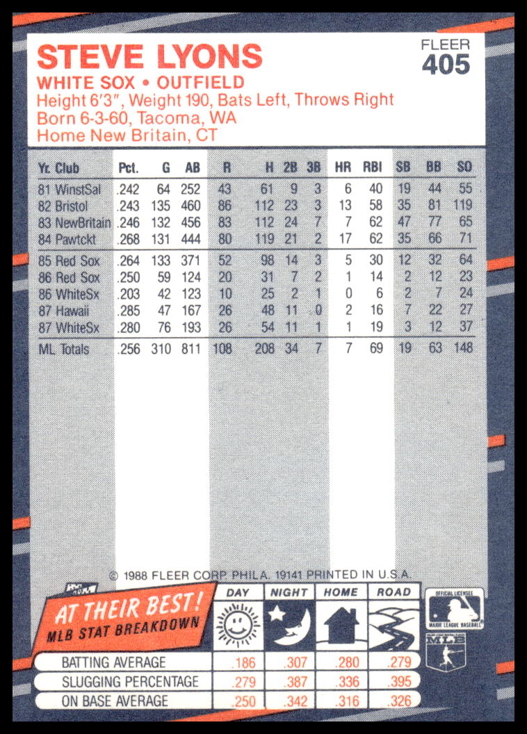 This Baseball card, from 1988 is part of the Fleer  card set. Steve Lyons is featured and has a card number of 405.