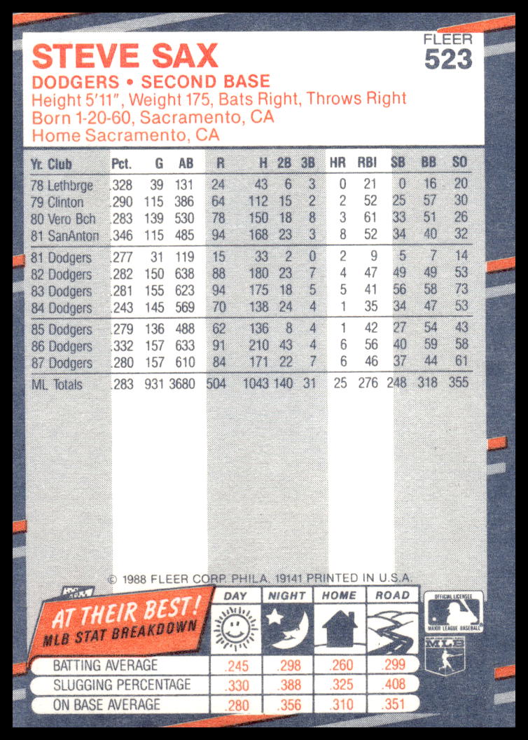This Baseball card, from 1988 is part of the Fleer  card set. Steve Sax is featured and has a card number of 523.