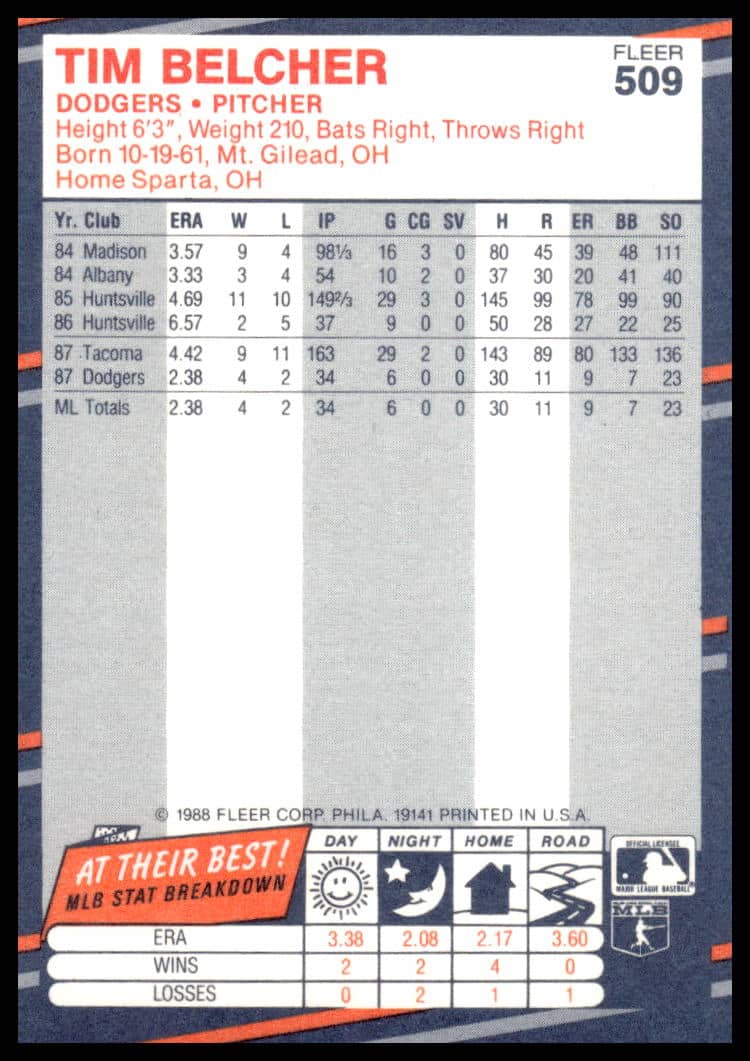 This Baseball card, from 1988 is part of the Fleer  card set. Tim Belcher is featured and has a card number of 509.