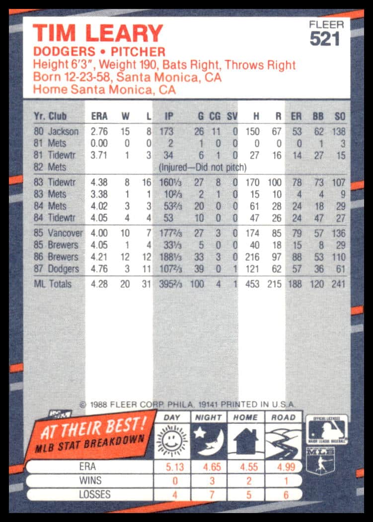 This Baseball card, from 1988 is part of the Fleer  card set. Tim Leary is featured and has a card number of 521.