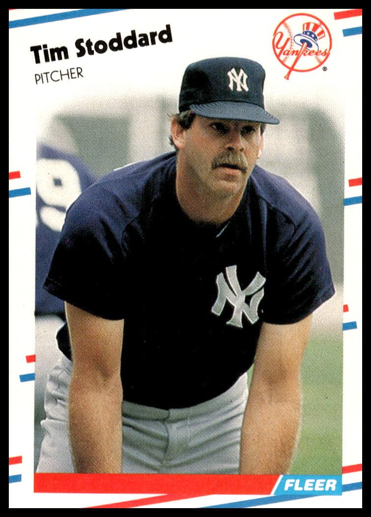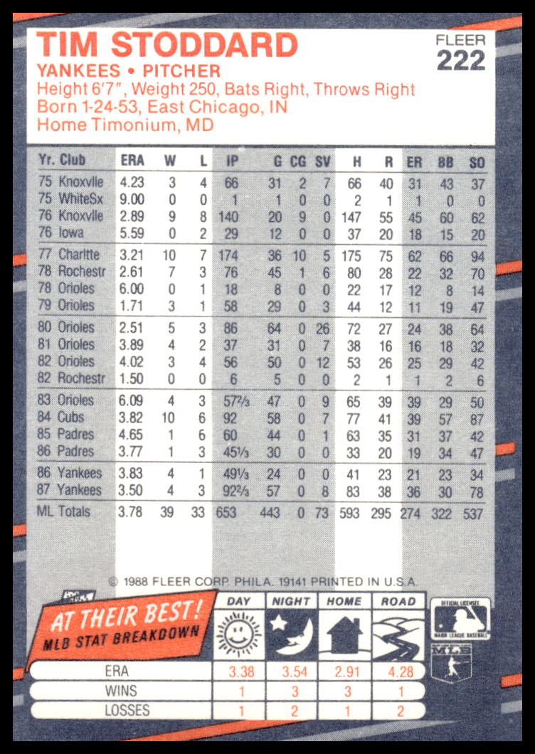 This Baseball card, from 1988 is part of the Fleer  card set. Tim Stoddard is featured and has a card number of 222.