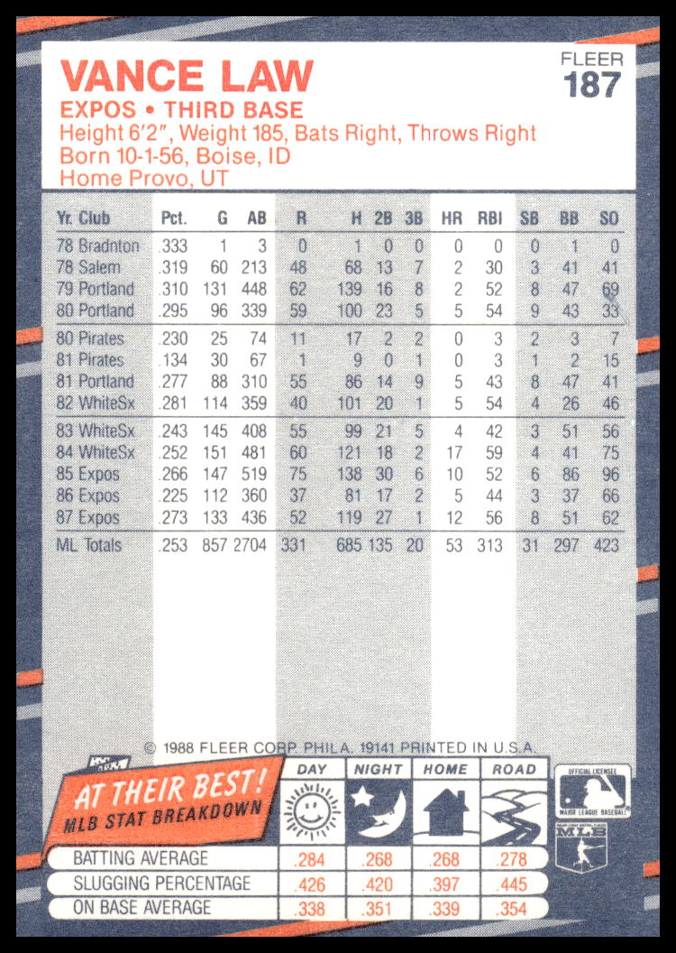 This Baseball card, from 1988 is part of the Fleer  card set. Vance Law is featured and has a card number of 187.