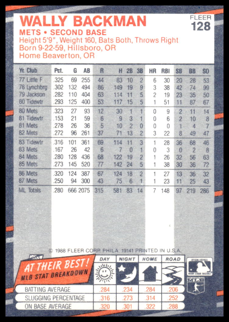 This Baseball card, from 1988 is part of the Fleer  card set. Wally Backman is featured and has a card number of 128.