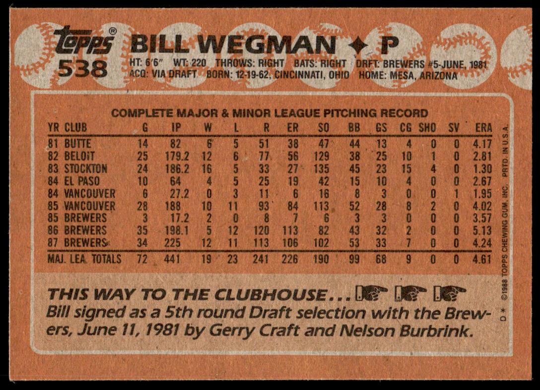 This Baseball card, from 1988 is part of the Topps  card set. Bill Wegman is featured and has a card number of 538.
