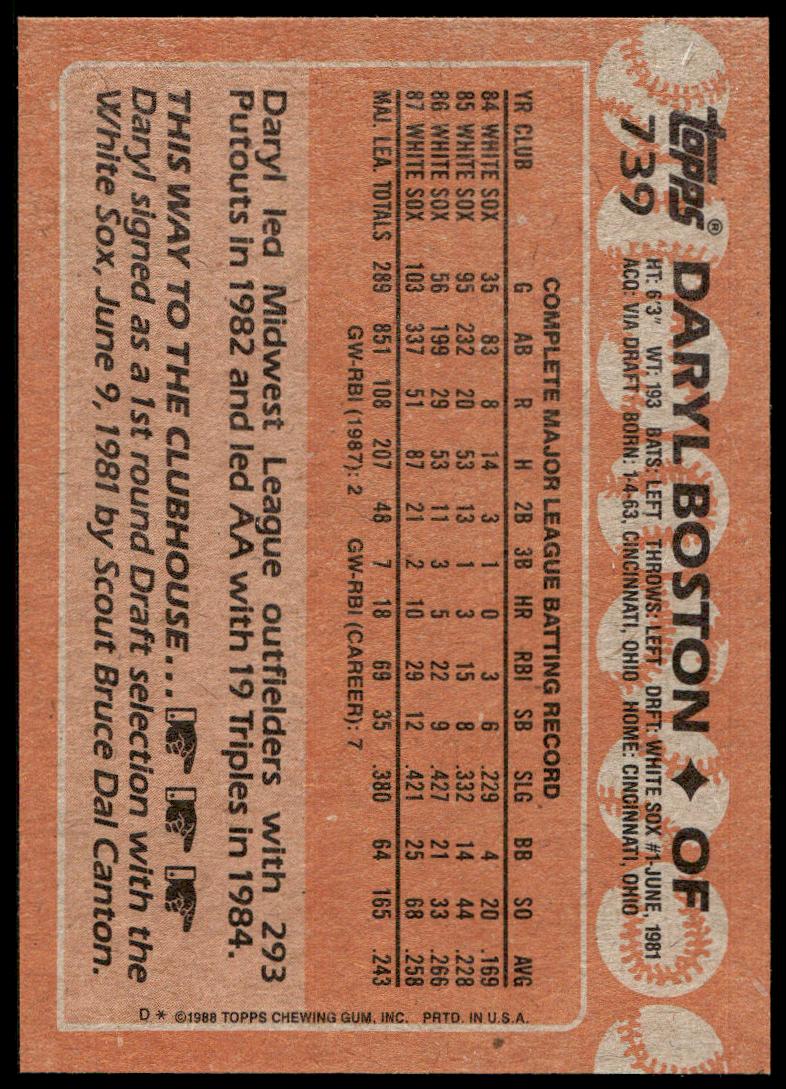 This Baseball card, from 1988 is part of the Topps  card set. Daryl Boston is featured and has a card number of 739.