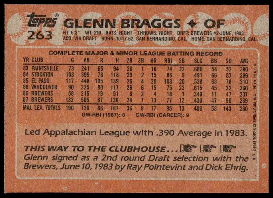 This Baseball card, from 1988 is part of the Topps card set. Glenn Braggs is featured and has a card number of 263.