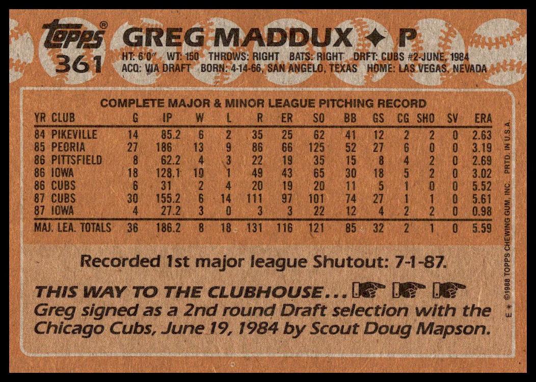 This Baseball card, from 1988 is part of the Topps  card set. Greg Maddux is featured and has a card number of 361.