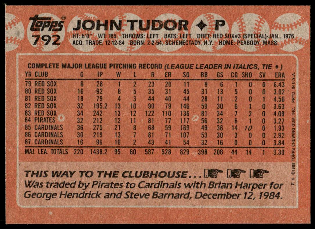 This Baseball card, from 1988 is part of the Topps  card set. John Tudor is featured and has a card number of 792.