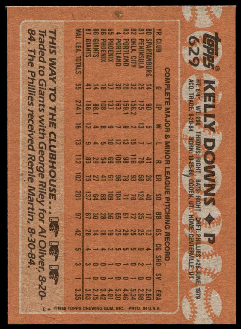 This Baseball card, from 1988 is part of the Topps  card set. Kelly Downs is featured and has a card number of 629.