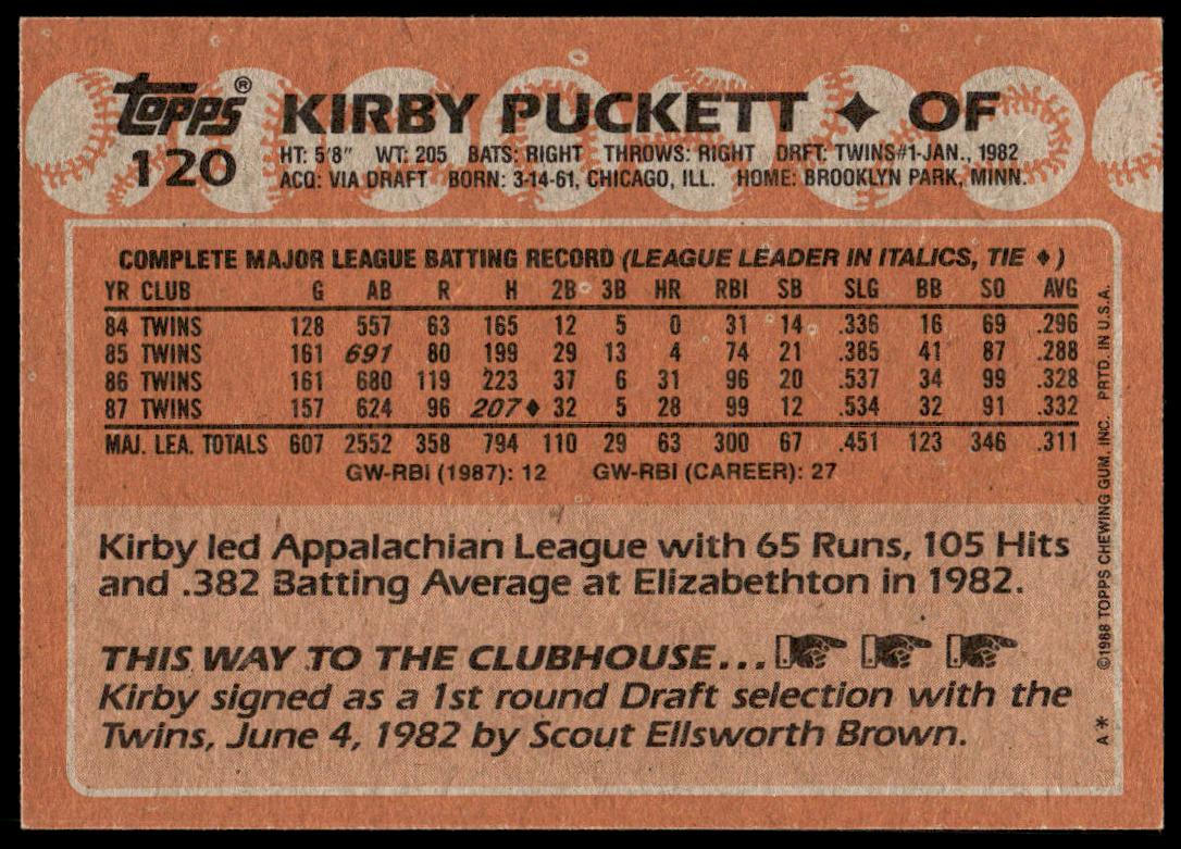 This Baseball card, from 1988 is part of the Topps  card set. Kirby Puckett is featured and has a card number of 120.