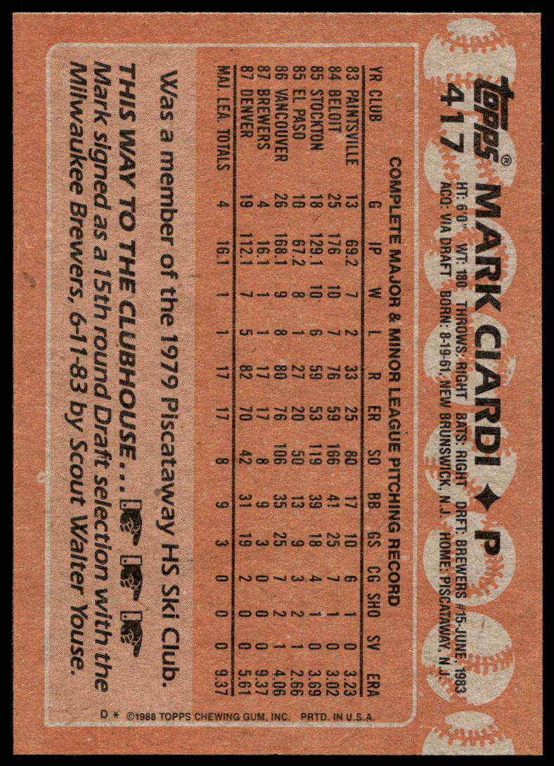 This Baseball card, from 1988 is part of the Topps  card set. Mark Ciardi is featured and has a card number of 417.