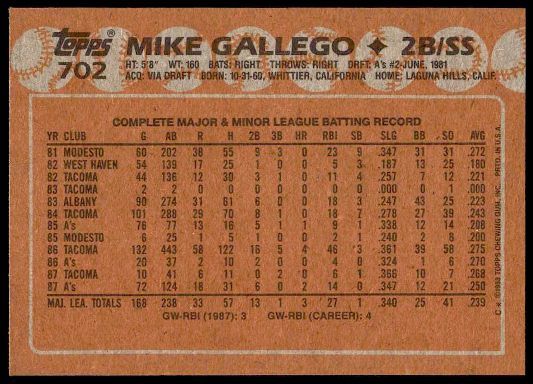 This Baseball card, from 1988 is part of the Topps card set. Mike Gallego is featured and has a card number of 702.