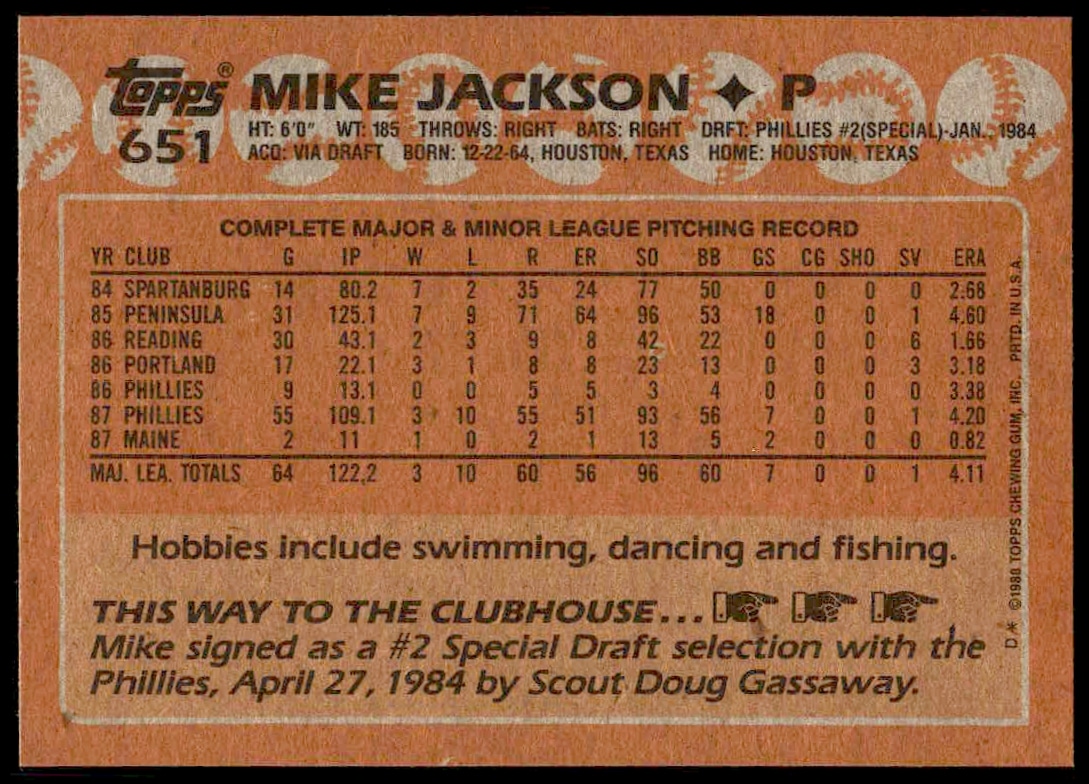 This Baseball card, from 1988 is part of the Topps card set. Mike Jackson is featured and has a card number of 651.