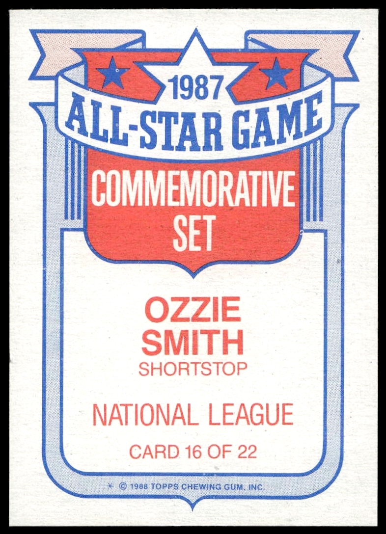 This Baseball card, from 1988 is part of the Topps card set. Ozzie Smith is featured and has a card number of 16.