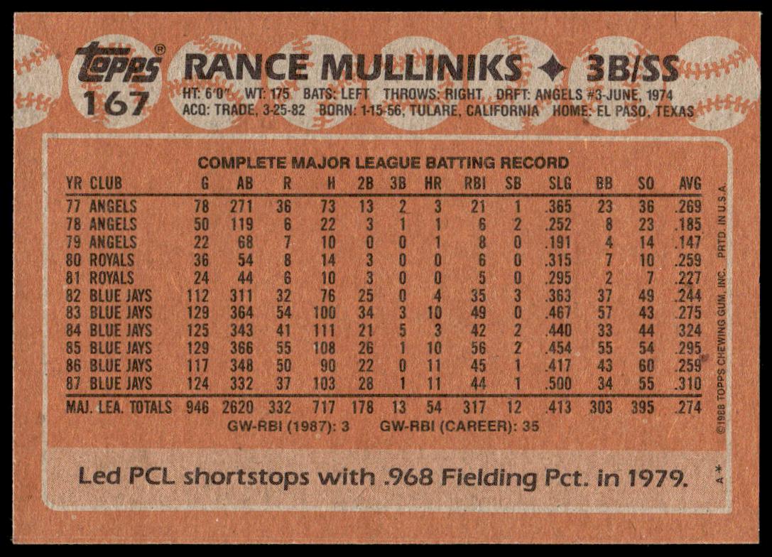 This Baseball card, from 1988 is part of the Topps  card set. Rance Mulliniks is featured and has a card number of 167.