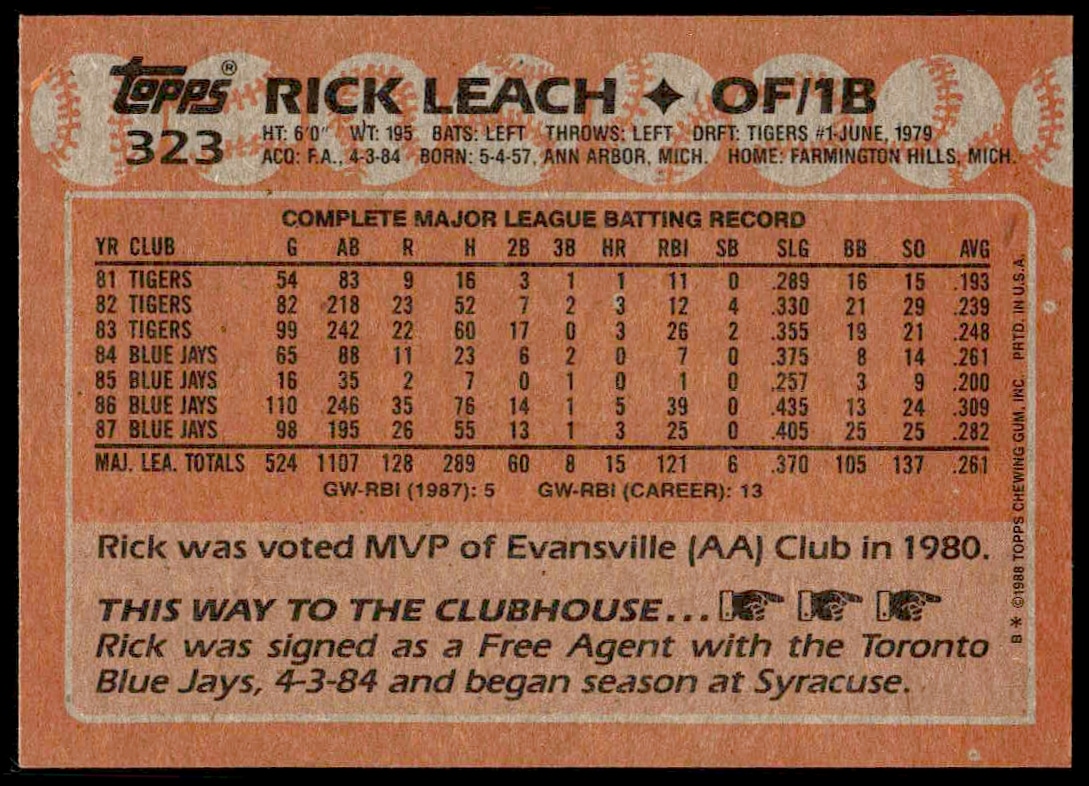 This Baseball card, from 1988 is part of the Topps card set. Rick Leach is featured and has a card number of 323.