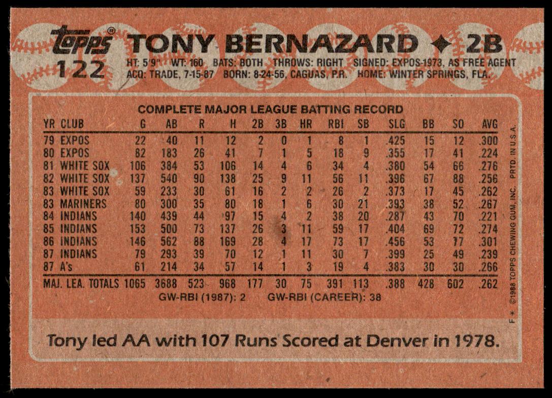 This Baseball card, from 1988 is part of the Topps  card set. Tony Bernazard is featured and has a card number of 122.